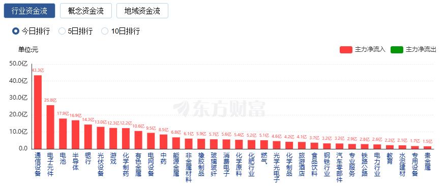 行业资金方面,截至收盘,通信设备、电子元件、电池等净流入排名靠前,此中通信设备净流入43。35亿。