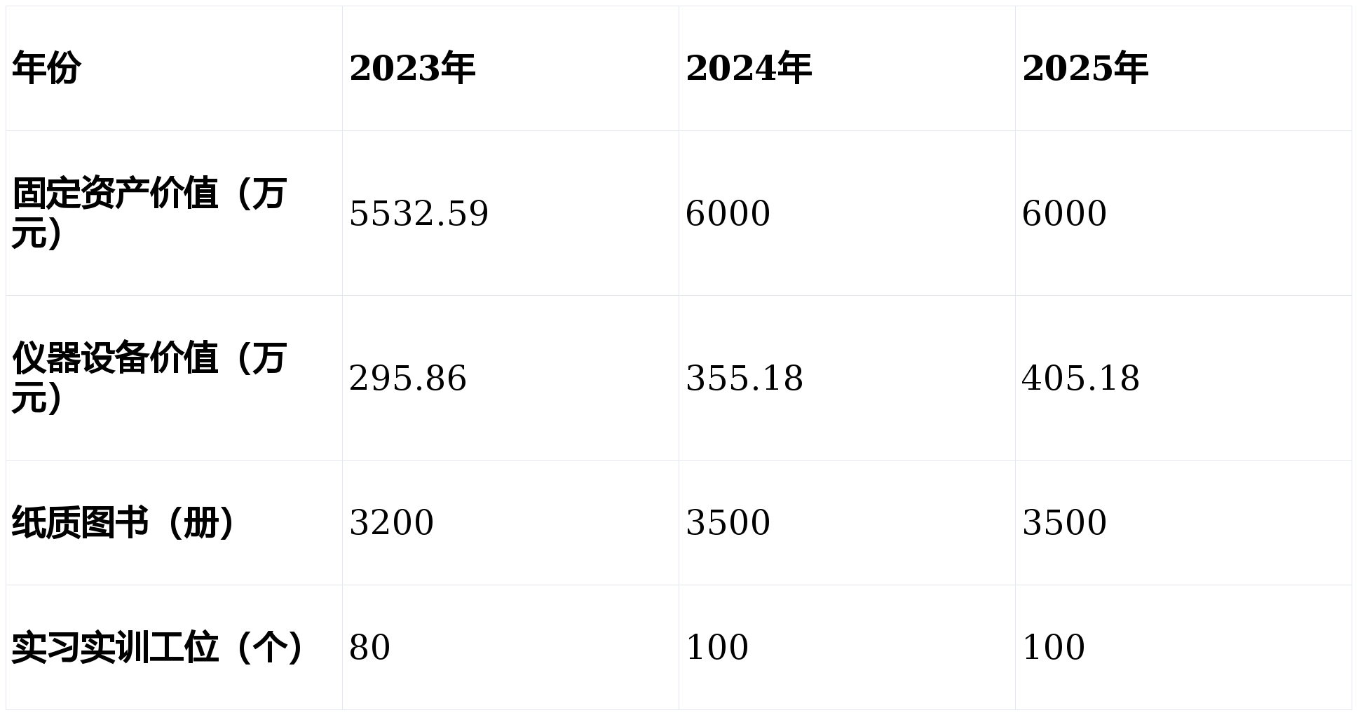 2025年,学校固定资产总值为6000万元,此中讲授仪器设备总值 405。18万元,较客岁增加50万;生均讲授仪器设备值55486。88元。学校共有校内练习实训工位数100 个,取客岁持平,生均练习工位数达到1。56个;纸质图书3500册,生均纸质图书54。69册。